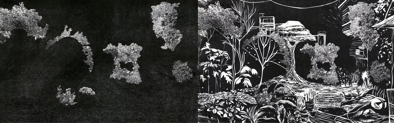 Back Yard (diptych), 2023, 11 x 36 in, Woodcut Printmaking